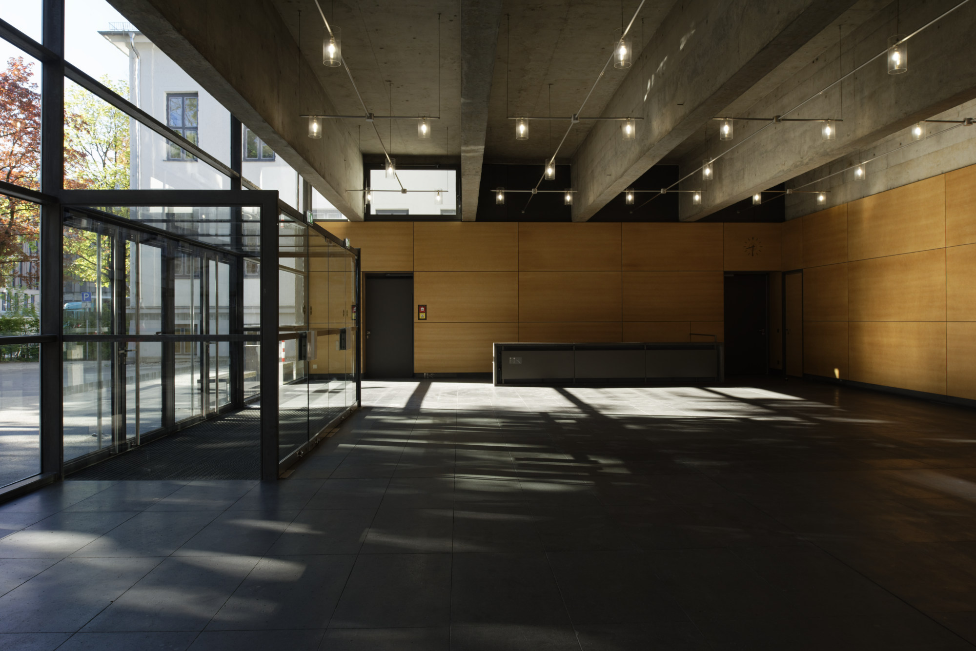 Der Sichtbetonbau aus den 1960er Jahren ist im Innern großflächig mit Holzverkleidungen versehen. Der hinter einem großzügigen Foyer liegende Hörsaal wird von einer gestuften, abgehängten, holzsichtigen Unterdecke überspannt. Die damalige Planung und Ausführung ließ eine hochwertige, durch sorgfältige Detailausbildung geprägte Architektur entstehen, die bei der Sanierung weitmöglichst erhalten werden sollte.